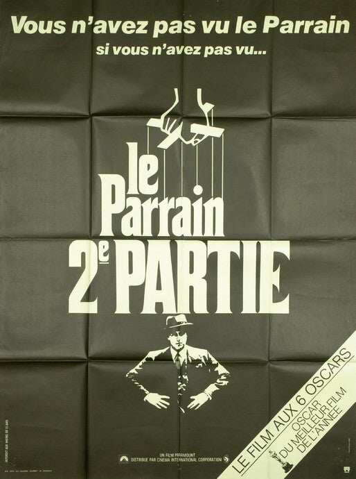 Grande affiche française du film mythique « Le Parrain II », de Francis Ford Coppola, avec Al Pacino et Robert de Niro . Elle date de la première sortie française en salles, en 1974.