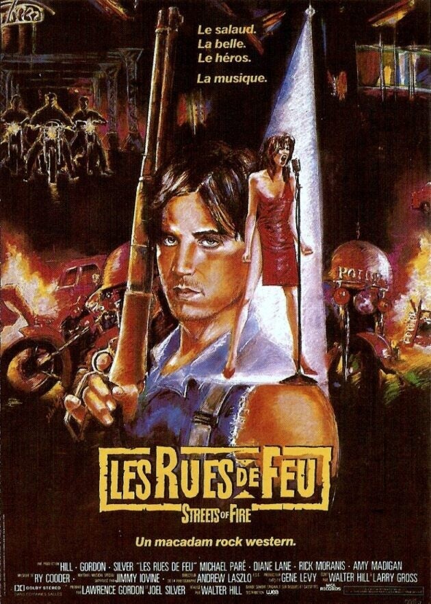 Grande affiche française du film de Walter Hill « Les Rues de feu » (Streets of fire en VO). Elle date de la première sortie française en salles, en 1984.