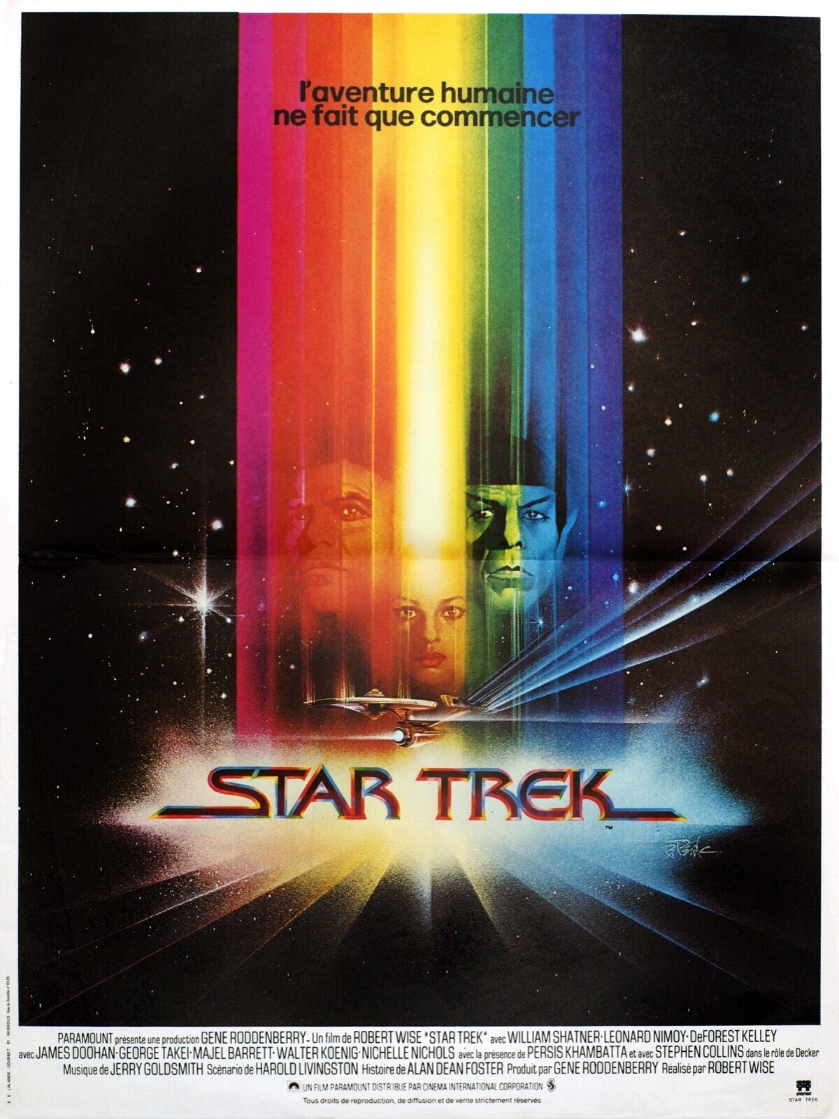 Grande affiche française du film mythique « Star Trek », d’après la série éponyme, avec William Shatner et Leonard Nimoy. Elle date de la première sortie française en salles, en 1979.