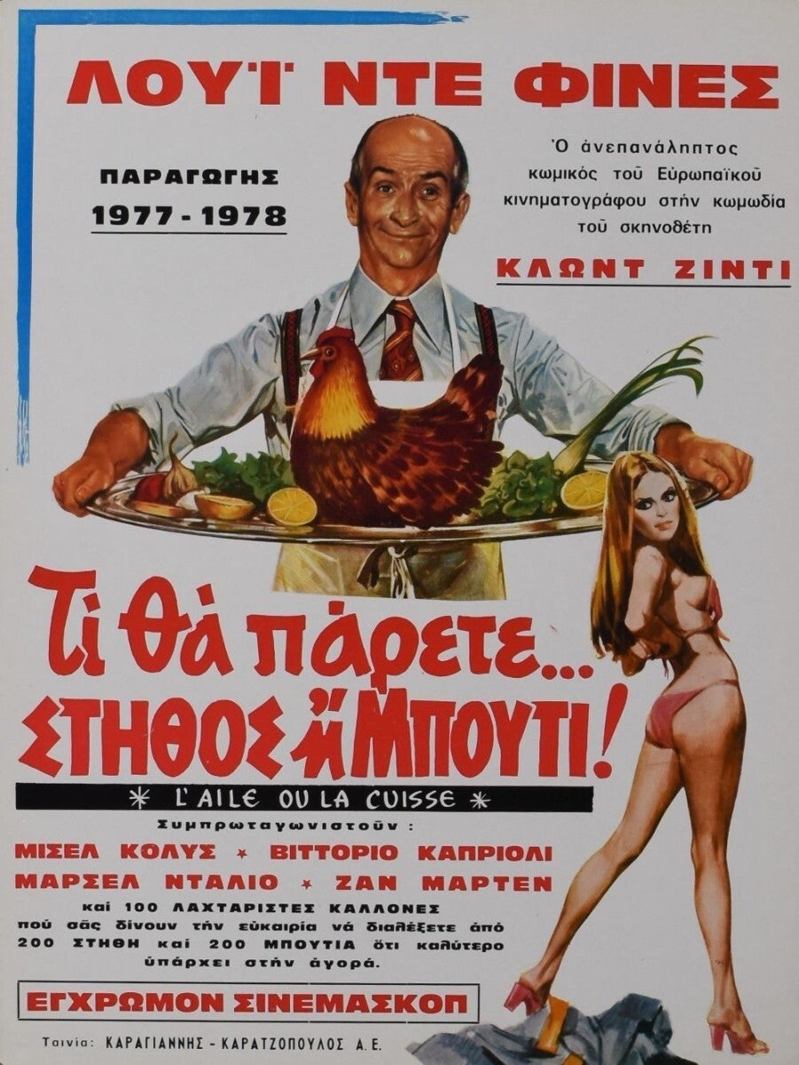 Affiche Cinéma originale grecque du film de Claude Zidi L'aile ou la cuisse, avec Louis de Funès et Coluche.