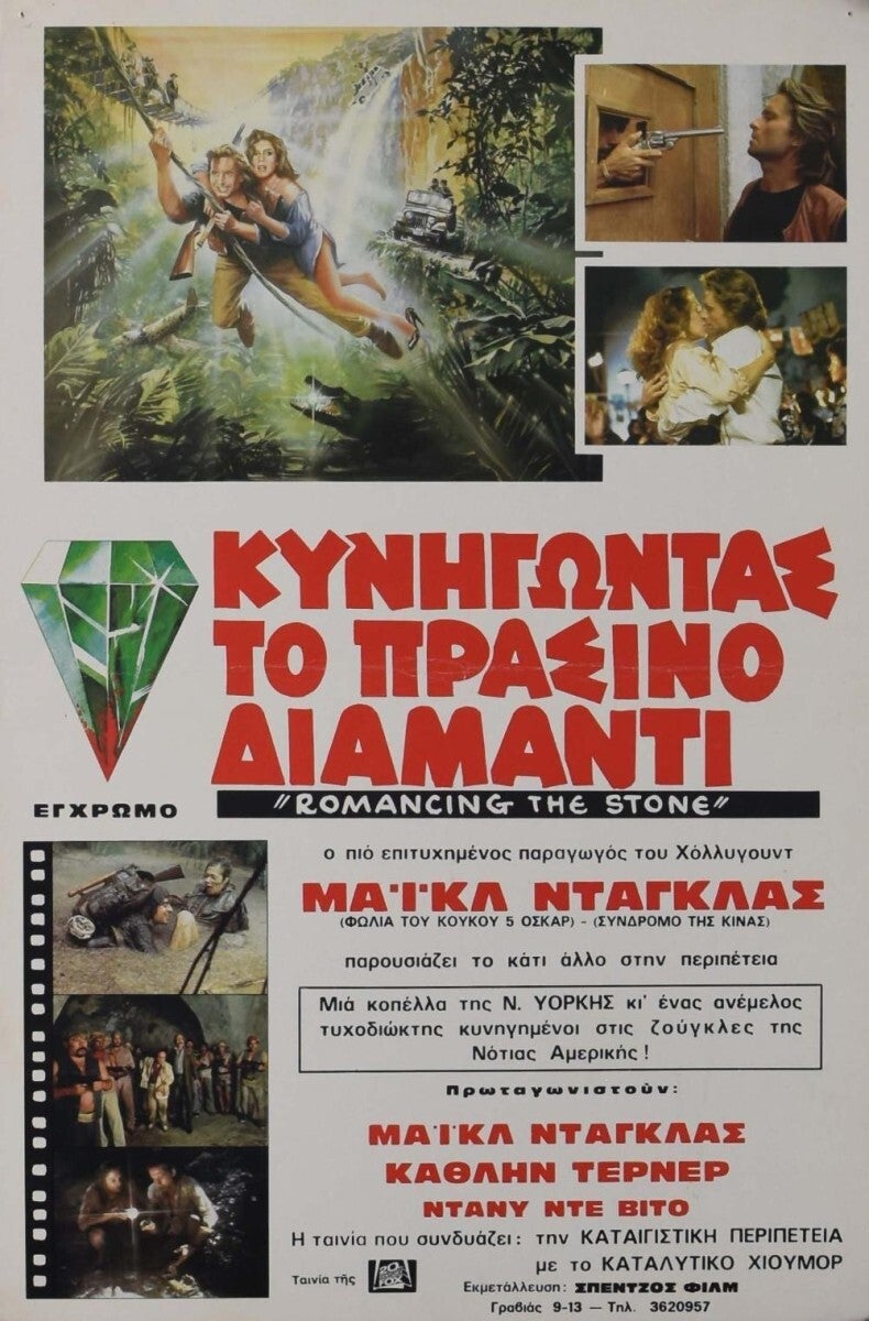 Affiche Cinéma originale grecque du film de Robert Zemeckis A la poursuite du Diamant Vert, avec Michael Douglas et Kathleen Turner.