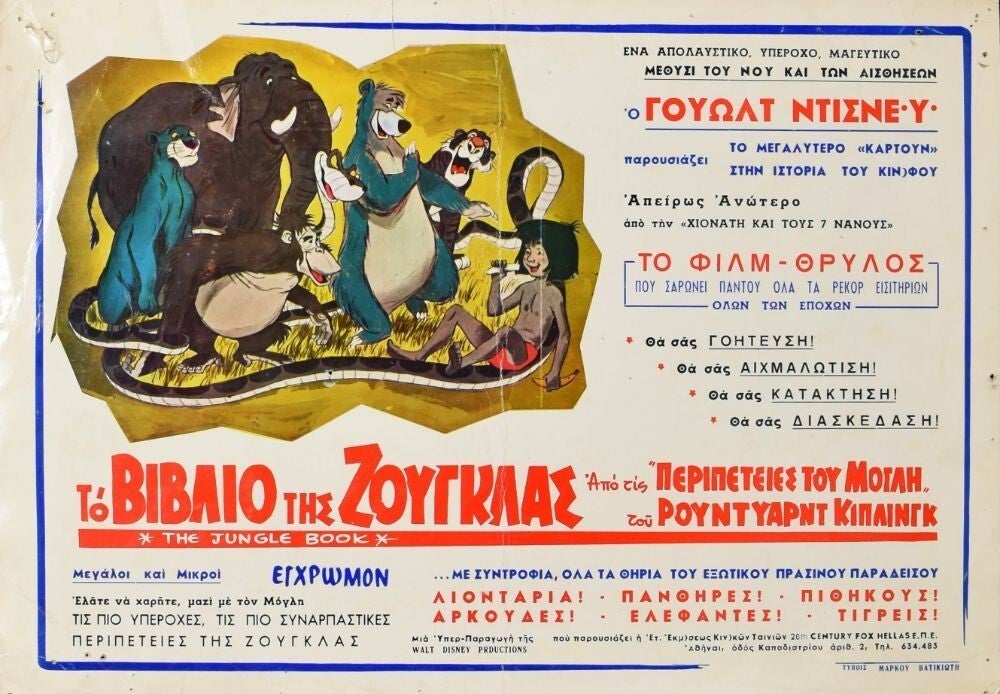 Pièce rarissime : Affiche Cinéma originale grecque du dessin animé Le Livre de la Jungle, de Walt Disney, pour la première sortie au cinéma.
