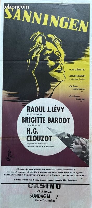Affiche cinéma originale suédoise du La Vérité, avec Brigitte Bardot.